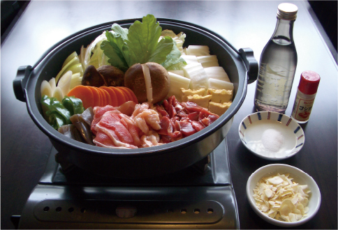 この鍋料理は、酒蔵で働く蔵人に栄養をつけてあげたいと当時の役員が考案しました。作業の合間に食べても、利き酒に影響がでないように、砂糖や醤油での味付けをしない、あっさりして食の進む料理です。