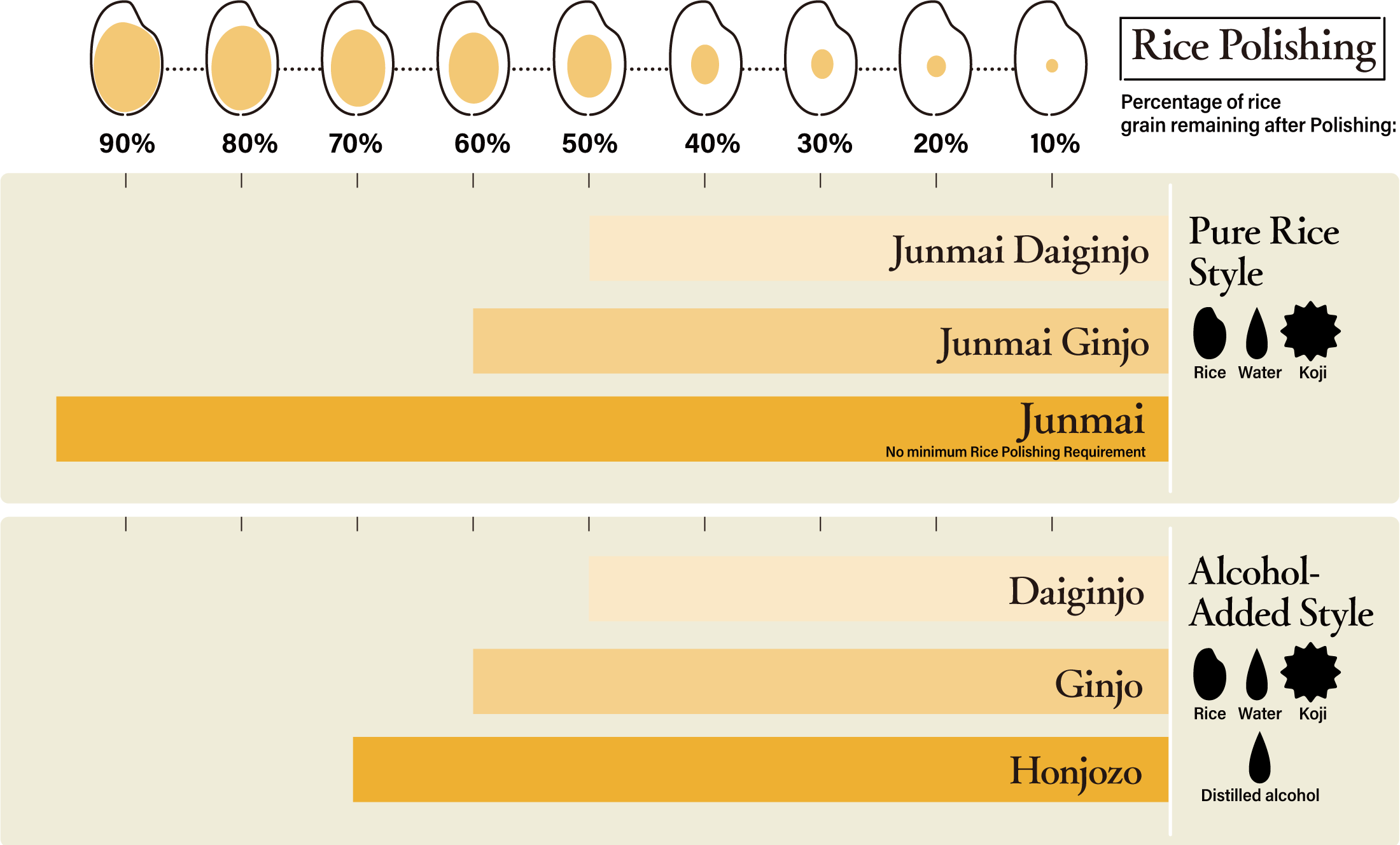 This chart below indicates the classifications of sake which are based on ingredients and rice milling percentage.