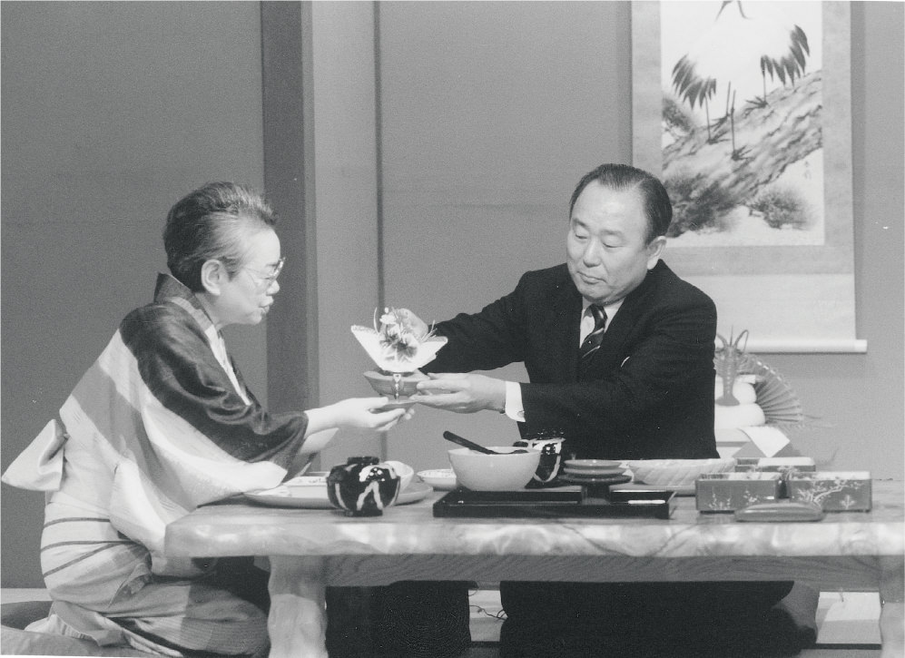 酒は文化であるともいわれますが、それを身をもって実践したのが高度経済成長期以降の賀茂鶴の発展を支えた石井泰行前会長でした。1957(昭和32)年に賀茂鶴入社後しばらくして東京出張所(当時)勤務となると、灘や伏見の酒との知名度の差に愕然とします。そこで、「自分が賀茂鶴の広告塔になろう」と決意。積極的に文化人と交わり、普及活動に努めていったのです。起点となったのは故郷・西条、広島のつながりでした。実家も近所同士で知己があった東映の岡田茂会長(当時)から可愛がられ、さまざまな文化人・財界人に人脈を広げていきました。日本精工社長で日本経済団体連合会(経団連)常任理事の今里広記氏。広大附属の先輩であり新日本製鐵会長、経済同友会代表幹事、日本商工会議所会頭を歴任した永野重雄氏。永野氏と親交の深かったホテルニューオータニの大谷米太郎氏、米一氏父子。広島出身の藤田組(現・フジタ)社長の藤田一暁氏、永谷園社長の永谷博氏。伊藤園社長の本庄正則氏、広島出身で東京ドーム社長・会長を務めた林有厚氏など。石井前会長は、いくつもの社長会に所属して財界人脈の構築に努め、東京市場での拡売に大きく貢献しました。先述した十二代酒井田柿右衛門氏からの柿右衛門窯とのご縁は続き、今も豪華賀茂鶴は作り続けられています。また、文化人の方々に酒のラベルの題字をお願いすることもありました。文化勲章受章者の書家・金子鷗亭氏が「冨嶽賀茂鶴」、一休寺住職・田辺宗一氏が「瑞兆賀茂鶴」、漆の重要無形文化財保持者(人間国宝)室瀬和美氏が「吉祥賀茂鶴」、千家十職である釡師・大西清右衛門氏が「光壽賀茂鶴」の題字を手がけています。文化人との交わりの中で磨かれ、賀茂鶴は成長していきました。