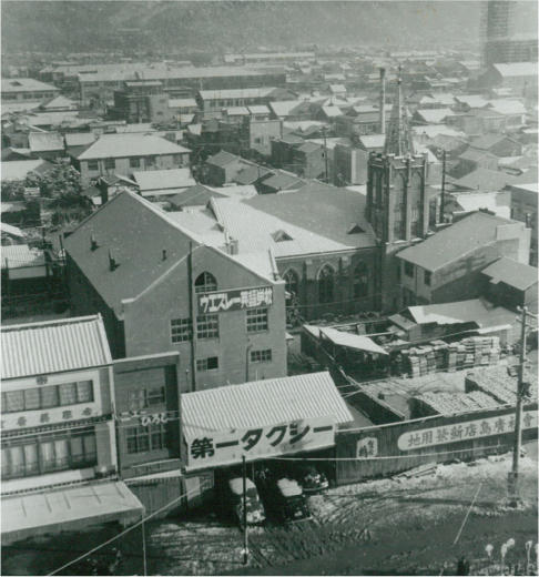播磨屋町19番にあった頃の賀茂鶴広島店前(現在の本通り商店街)