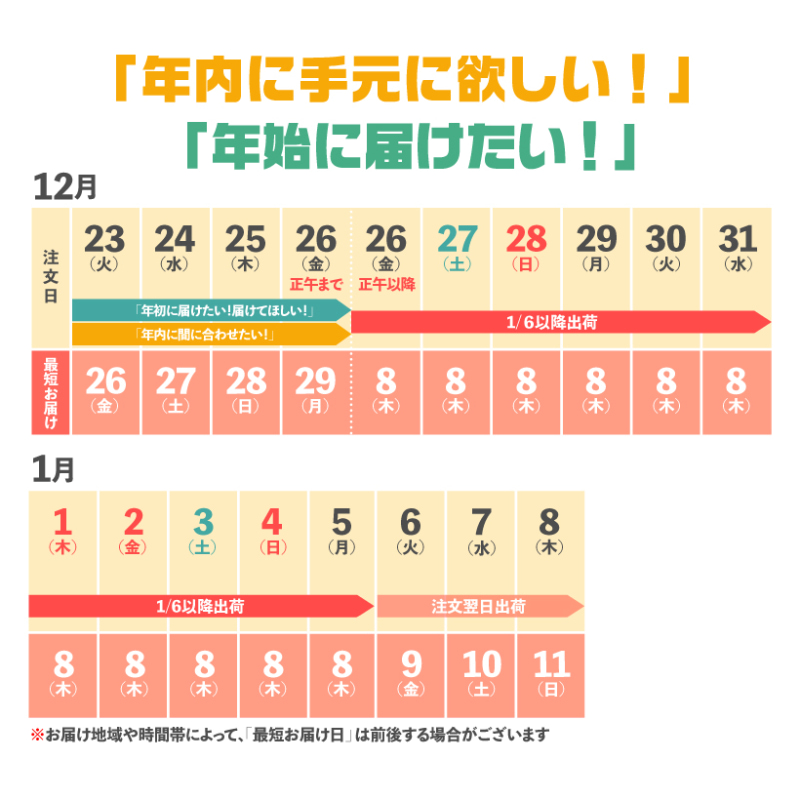 弊社の年内最終出荷は12月26日(金)正午までのご注文分とさせていただきます。それ以降のご注文は1月6日(火)以降の出荷です。