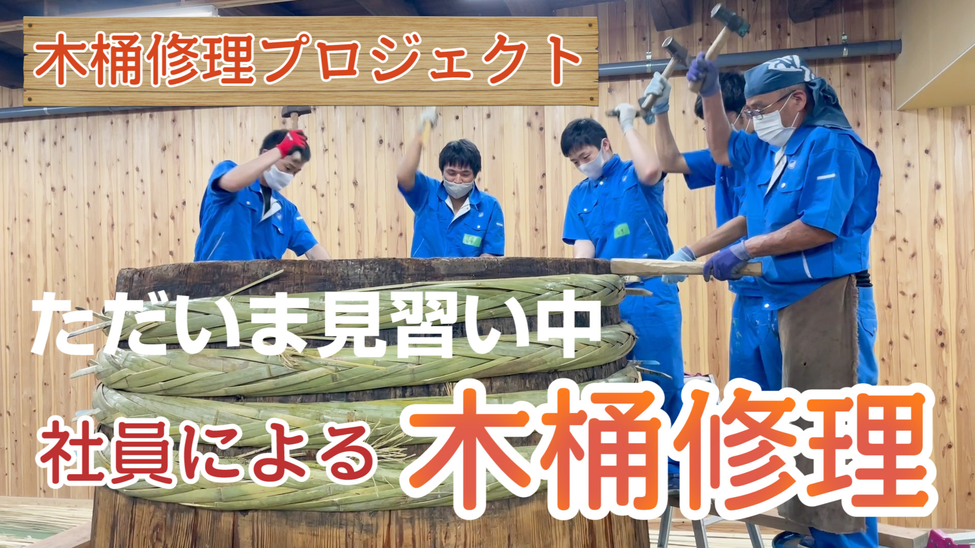 箍の交換は、藤井製桶所様の指導を受けながら、弊社社員たちが行いました。